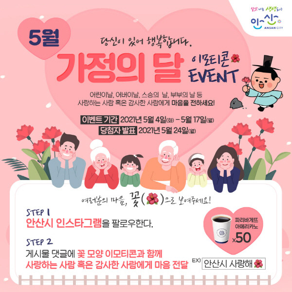 [프레스뉴스] 김대일 기자= 안산시(시장 윤화섭)는 가정의 달인 5월을 맞아 오는 17일까지 안산시 공식 인스타그램 채널을 활용한 이모티콘 이벤트를 진행한다고 11일 밝혔다.