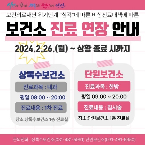 이와 함께 상록수보건소와 단원보건소도 평일 오후 8시까지 진료실 운영을 2시간씩 연장하고, 지역의료기관 간의 비상 진료 체계 핫라인을 유지하는 등 의료공백으로 인한 시민 피해를 최소화하는 데 주력하고 있다. 보건소 진료 연장 운영은 상황이 종료될 때까지 지속된다.