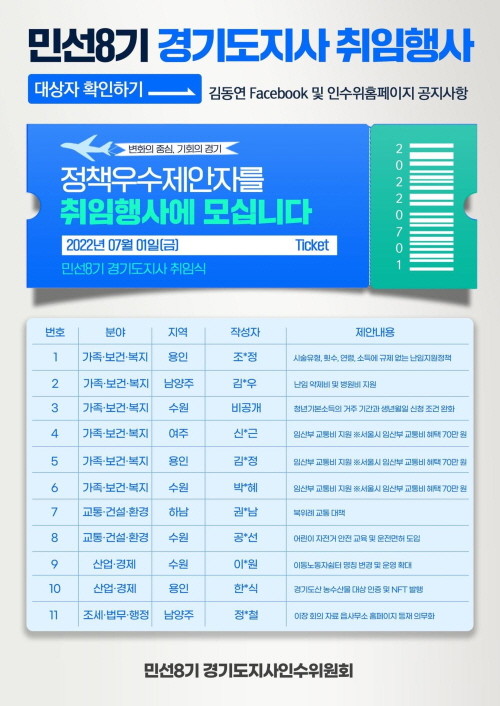[프레스뉴스] 장현준 기자= 민선 8기 경기도지사직 인수위원회 공식 홈페이지인 ‘똑톡! 경기제안’에 ‘우수 정책’을 제안한 도민 11명이 다음 달 1일 열리는 김동연 경기도지사 취임식에 공식 초청된다.