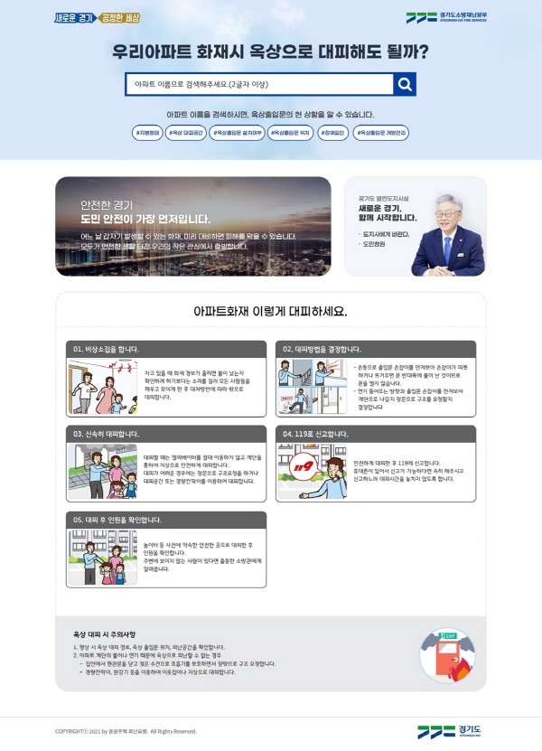 경기도청 또는 소방관서 홈페이지에 접속해 해당 배너를 클릭하면 옥상출입문 정보제공 홈페이지로 이동된다. 여기서 검책창에 아파트명을 입력하면 ▲옥상 출입문 설치 여부와 ▲출입문 위치 ▲옥상 대피공간 ▲대피공간 면적 ▲출입문 개방 상태 ▲유도등 설치 여부 ▲옥상 출입문 재질 ▲지붕형태 등 총 8가지의 정보를 열람할 수 있다.