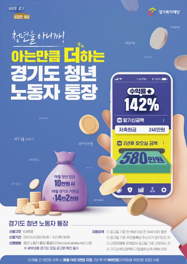 경기도 청년 노동자 통장이란 참여자가 2년간 일자리를 유지하면서 매달 10만 원씩 저축하면 경기도 지원금 월 14만2,000원이 추가 적립돼 2년 후 580만 원(현금 480만 원과 지역화폐 100만 원)을 받을 수 있다.