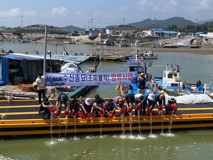 지난 5일 손불면 월천항 일대에서 진행된 이번 방류 작업에는 월천 어촌계, 전라남도 해양수산과학원 관계자 등 30여 명이 참여했다.