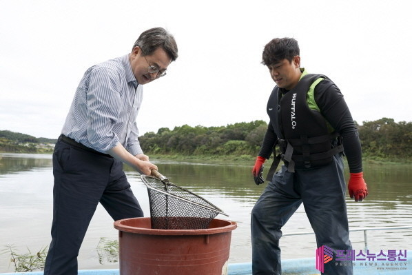 | ▲지난해 10월 14일 김동연 지사가 한탄강에서 청년어부와 참게를 옮기고 있다.(사진=경기도) |