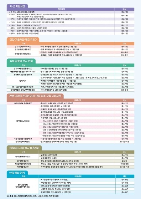 이 밖에도 수출기업 물류비 지원, 중소기업육성자금 등 다양한 기업 지원 사업 신청 시 가점을 부여하는 등 74종의 혜택이 제공된다. 특히 올해는 ‘4.5일제 지원 사업’과 주 20시간(0.5잡), 주 30시간(0.75잡) 형태의 단축근무를 지원하는 ‘경기가족친화기업 0.5&0.75잡 지원 사업’ 참여 기업에도 가점을 부여해 일‧생활 균형 정책을 적극 실천하는 기업을 우대할 계획이다.