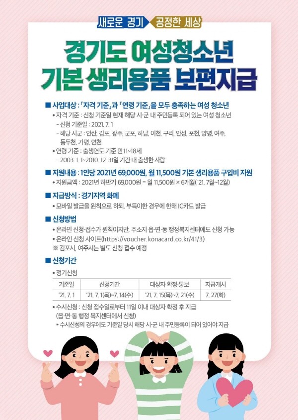경기도의 ‘여성청소년 기본생리용품 보편 지원’은 사업 참여를 신청한 안산, 군포, 광주, 김포, 이천, 안성, 하남, 여주, 양평, 구리, 포천, 동두천, 가평, 연천 등 14개 시·군에 거주하는 2003년 1월 1일~2010년 12월 31일 출생인 여성청소년(약 10만9,000명)이면 누구나 신청할 수 있다.