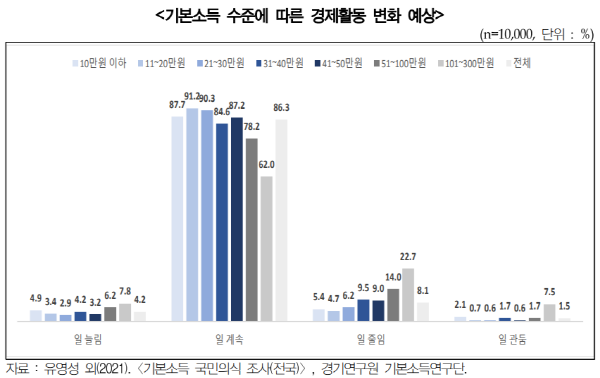 유영성 단장은 “월 50만 원 수준 이상으로 기본소득 금액이 커질수록 일을 줄이거나 그만둘 수는 있지만, 월 101~300만 원의 기본소득을 지급하더라도 일을 줄이겠다는 국민은 22.7%에 불과했다”면서 “일을 줄일 수 있는 경우조차도 여가를 즐기겠다는 의견이 높은 만큼 기본소득 지급으로 경제활동이 줄어들 것이라는 우려는 바로잡을 필요가 있다”고 말했다.