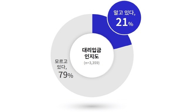 이번 조사 전 대리입금을 인지하고 있던 인원은 전체 21%(699명)였으며, 이들은 친구 등 주변 사람(31%) 혹은 유튜브(29%), 페이스북(26%), 트위터(24%) 등 사회관계망서비스를 통해 대리입금을 알았다고 답했다.