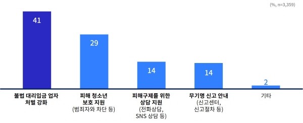 이에 전체 응답자(3,359명)는 관련 지원 대책으로 ▲불법 대리입금업자 처벌 강화(41%) ▲범죄자와 차단 등 피해 청소년 보호 지원(29%) ▲피해구제를 위한 상담 지원(14%) ▲무기명 신고 안내(14%) 등을 제시했다.