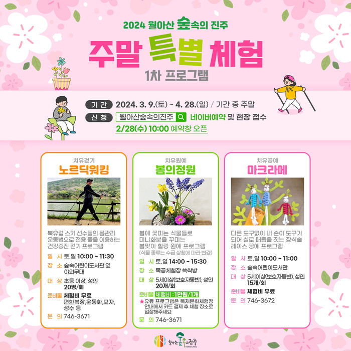 프로그램 신청은 오는 28일부터 네이버 예약 또는 월아산 숲속의 진주에서 현장 접수 받는다. 기타 자세한 사항은 월아산 숲속의 진주 홈페이지(www.jinju.go.kr/forestjinju)에서 확인할 수 있다.