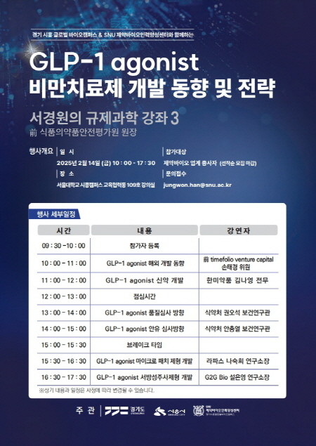 [프레스뉴스] 장현준 기자= 시흥시(시장 임병택)가 2월 14일 서울대학교 시흥캠퍼스 교육협력동에서 제약ㆍ바이오 업계 근무자와 관계기관의 담당자를 대상으로 ‘글루카곤유사펩타이드(GLP)-1 agonist 비만치료제 개발 동향 및 전략’ 강좌를 연다.