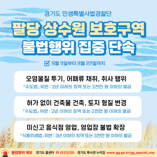 [프레스뉴스] 장현준 기자= 경기도 민생특별사법경찰단이 9월 11일부터 22일까지 팔당상수원보호구역 내 불법행위를 집중 단속한다.