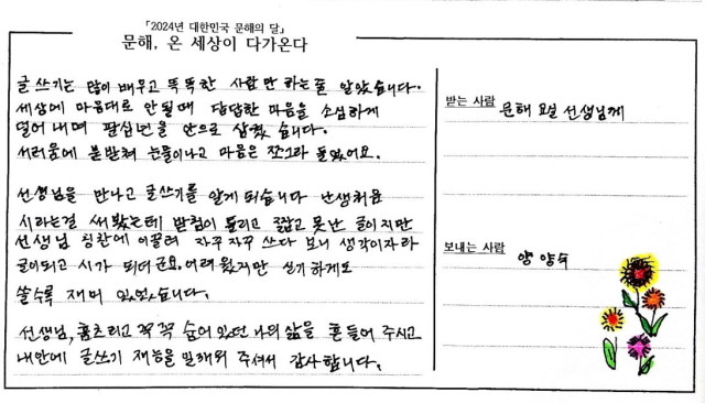 엽서 부문에서는 ▲국가평생교육진흥원장상 양*숙 어르신(문해교실선생님께, 노루우물작은도서관) ▲경기도평생교육진흥원장상 최우수 허*순 어르신(82살 허금순에게, 목감종합사회복지관), 조*순 어르신(사랑으로 뭉친반, 작은자리종합사회복지관) ▲경기도평생교육진흥원장상 우수상 김*순 어르신(나는 행복하다, 대야동주민자치회) 등 11명이 수상자 명단에 이름을 올렸다.