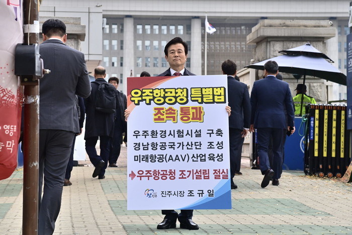 조 시장은 이날 ‘우주항공청 특별법 조속 통과, 우주환경시험시설 구축·경남항공국가산단 조성·미래항공(AAV) 산업육성을 위해서는 우주항공청 조기설립 절실’이라는 문구가 적힌 피켓을 들고 1인 시위에 나섰다.