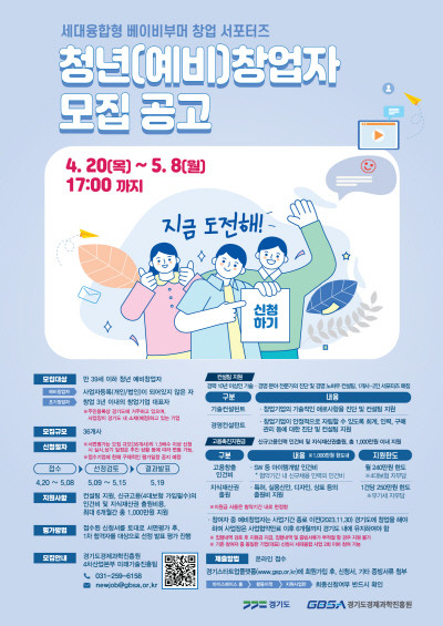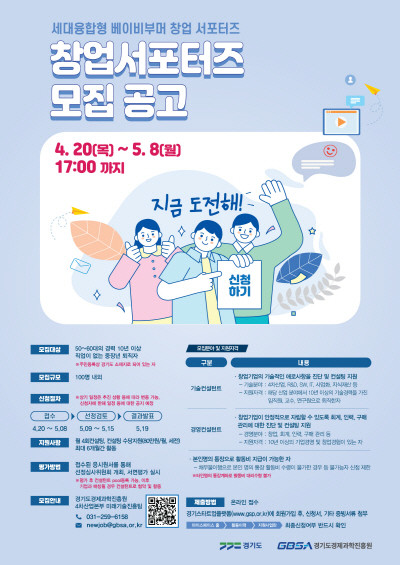 모집 대상은 ‘베이비부머 창업 서포터즈’의 경우 기술·경영 분야 경력 10년 이상의 50세 이상의 퇴직자, ‘청년 창업자’는 만 39세 이하의 예비 창업자 또는 창업 3년 이내의 초기 창업자로 모두 경기도에 거주해야 한다.