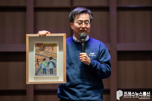 김 지사는 먼저 “19살 되는 중증장애인이 월 10만 원을 저축하면 10만 원을 추가 지원하는 경기도의 장애인 누림통장 사업을 하고 있다. 통장을 신청한 분 중 발달장애인 황진호 작가를 만나 ‘아빠와 함께’라는 작품을 샀다”며 “작가는 돈을 안 받고 싶어 했는데 제가 적정한 가격으로 작품을 구매한 첫 번째 사람이어서 작가가 아주 기뻐했다는 소리를 들었다”고 말했다.
