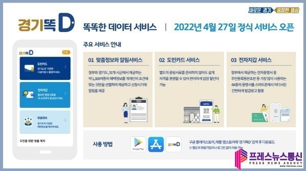 [프레스뉴스] 장현준 기자= 경기도가 공공마이데이터를 활용한 맞춤형 행정서비스인 ‘경기똑D’를 27일 정식 개시한다. 개인맞춤형 정보 알림에 도민카드와 전자지갑 서비스를 제공해 행정서비스 혁신을 시도한다는 계획이다.