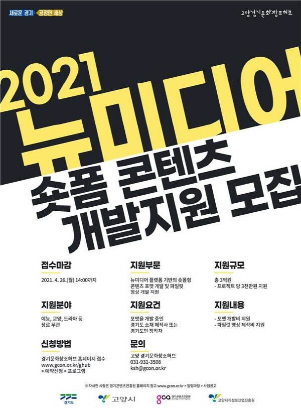 경기도와 고양경기문화창조허브는 도내 방송영상, 뉴미디어 콘텐츠 IP 확보 지원을 위한 ‘뉴미디어 숏폼 콘텐츠 개발지원’ 사업을 신설하고 5일부터 26일까지 참가기업(참가자)을 모집한다.