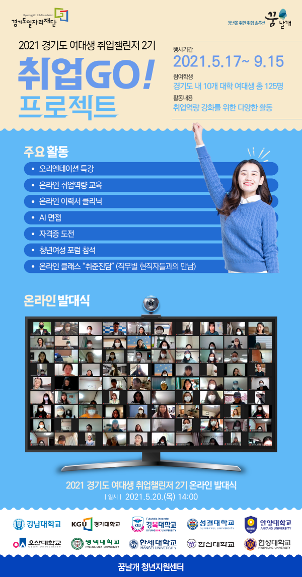 [프레스뉴스] 강보선 기자= 경기도와 경기도일자리재단은 지난 20일 도내 여대생들에게 다양한 취업지원 서비스를 제공하는 ‘경기도 여대생 취업챌린저 2기’ 온라인 발대식을 개최했다.