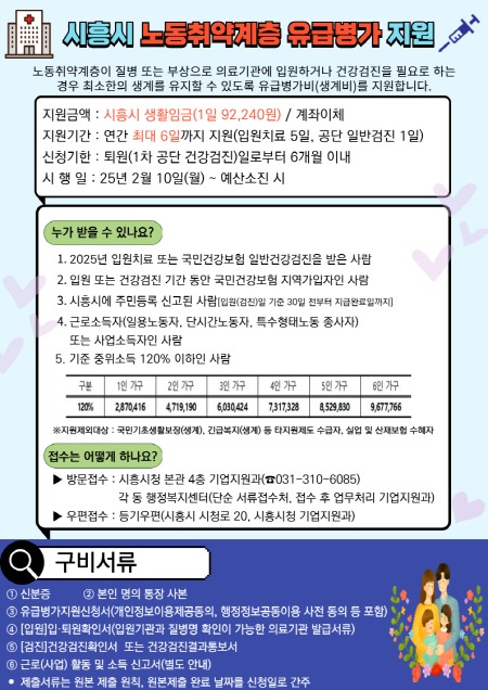 [프레스뉴스] 장현준 기자= 시흥시(시장 임병택)가 ‘2025년 노동취약계층 유급병가 지원사업’을 2월 10일부터 시행한다.
