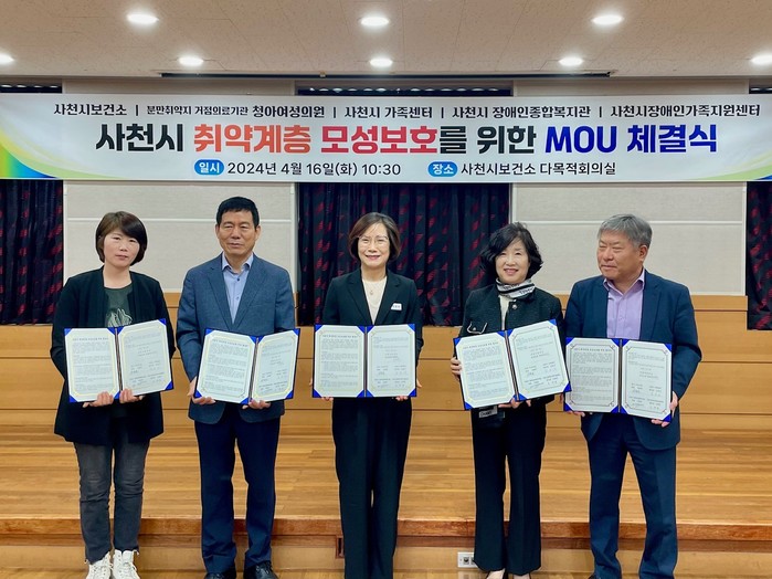16일 사천시보건소 3층 다목적실에서 사천시보건소, 청아여성의원, 사천시 가족센터, 사천시 장애인종합복지관, 사천시장애인가족지원센터 등 5개 유관기관이 단체협약을 체결했다.