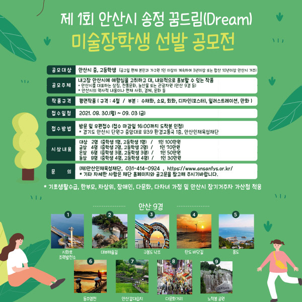 안산인재육성재단(이사장 윤화섭 안산시장)은 송정미술문화재단(이사장 이영희)과 함께 ‘제1회 안산시 송정 꿈드림(Dream) 미술 장학생 선발 공모전’을 개최한다고 10일 밝혔다.