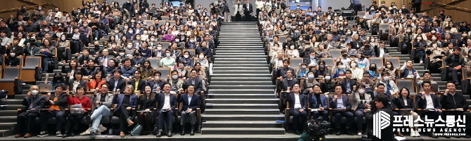 | ▲ 지난 20일 오후 경기도청 1층 대강당에서 열린 경바시, 챗GPT 혁신포럼에서 김동연 경기도지사, 강성천 경기도경제과학진흥원장, 장대익 가천대 교수, 최재식 카이스트 교수 등 인공지능 대학(원)생 등 200여명이 기념촬영을 하고 있다.(사진=경기도) |