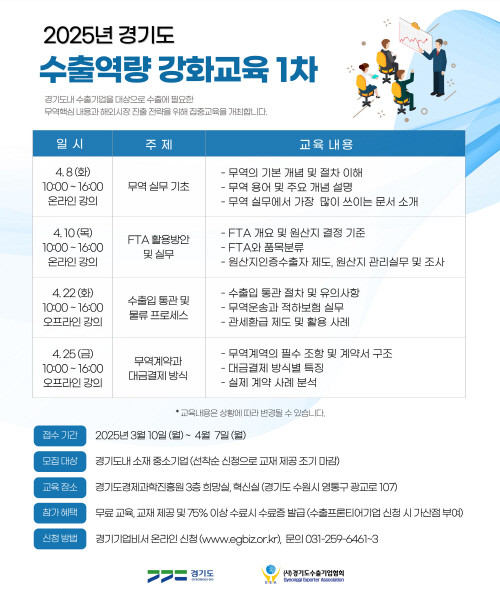 [프레스뉴스] 장현준 기자= 경기도는 도내 중소기업의 수출 경쟁력 강화를 위해 ‘2025년 경기도 수출역량강화 교육’ 1차 교육생을 4월 7일까지 모집한다.