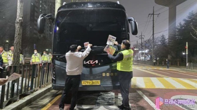 | ▲자율방범대 단원연합대원들이 지난 12일 와동 지역에서 어린이 보호구역에 불법 주차된 전세버스에 대형자동차 임시주차장 이용 안내 홍보 리플릿을 부착하고 있다.(사진=단원구) |
