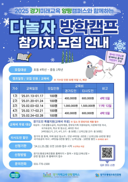 캠프는 내년 1월 13일부터 2월 28일까지 파주와 양평 캠퍼스에서 각각 진행된다. 참가 신청은 오는 25일부터 ‘경기도평생교육진흥원 누리집’을 통해 가능하며, 파주 캠퍼스 300명과 양평 캠퍼스 500명 등 총 800명을 선착순 모집한다.