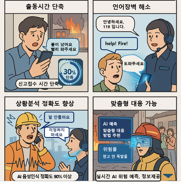 안전 분야 과제인 ‘AI 기반 119 신고접수 시스템’은 재난 발생 시 신고 내용을 즉각 문자로 변환하고 핵심 정보를 자동 추출하는 기술이다. ‘음성인식 기반의 119 신고접수 시스템 구축’을 통해 반복적인 질문 없이 신속하게 상황을 파악함으로써 재난 신고부터 출동 지령까지의 골든타임을 확보하는 것이 목표다.