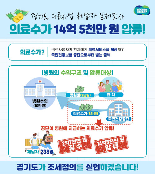 [프레스뉴스] 장현준 기자= 경기도는 세금을 체납중인 병원, 약국, 요양원 등 의료사업자 238명으로부터 의료수가 14억5천만 원을 압류했다고 1일 밝혔다.