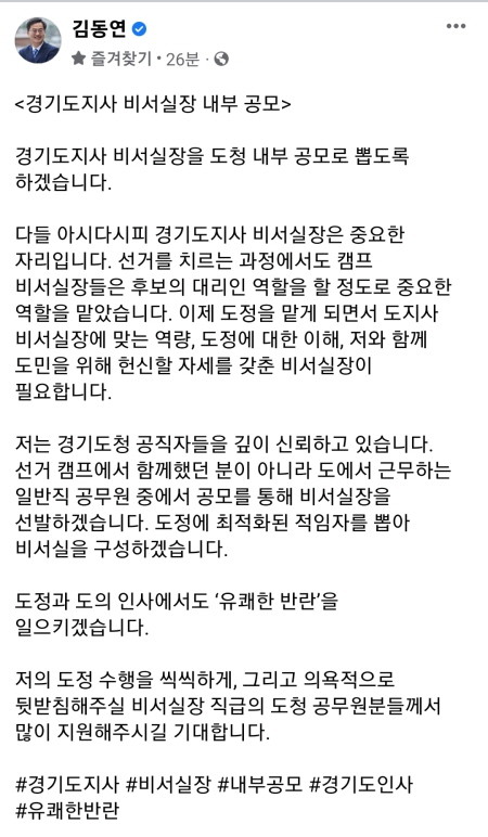 김 당선인은 비서실장 공모 배경으로 “도정과 도의 인사에서도 ‘유쾌한 반란’을 일으키겠다”며 “저의 도정 수행을 씩씩하게, 의욕적으로 뒷받침할 비서실장 직급의 도청 공무원이 많이 지원하기를 기대한다”고 밝혔다.