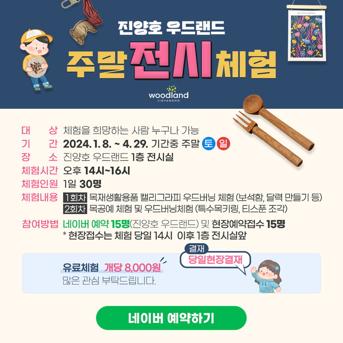 시 관계자는 “진양호 우드랜드에서 지역 우수 작가들의 작품을 감상하고, 작가들과 체험을 할 수 있는 기회”라며 “어린이 동반 가족 등 많은 시민분들이 방문해 함께 즐길 수 있기를 바란다”고 말했다.gihee233@naver.com