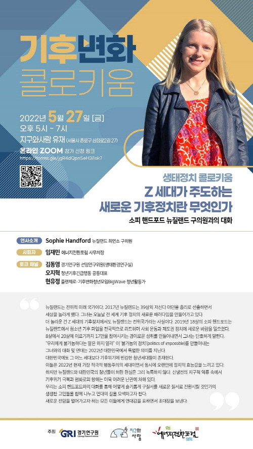 주제발표는 소피 핸드포드(Sophie Handford) 뉴질랜드 최연소 구의원이 맡았다. ‘Z세대가 주도하는 새로운 기후정치란 무엇인가’를 주제로 기후위기 극복을 위해 청년의 영역에서 실천적 해법을 만들어 갈 수 있는 구체적인 대안을 모색하고 구질서를 새로운 질서로 슬기롭게 전환하는 방안을 논의할 예정이다. 소피 핸드포드(21세)는 뉴질랜드 최연소 구의원으로 2019년에 뉴질랜드 청소년 기후파업을 전국적으로 주도하면서 17만 명을 참여시키는 등 사회 운동과 제도권 정치에 새로운 바람을 일으키고 있다.