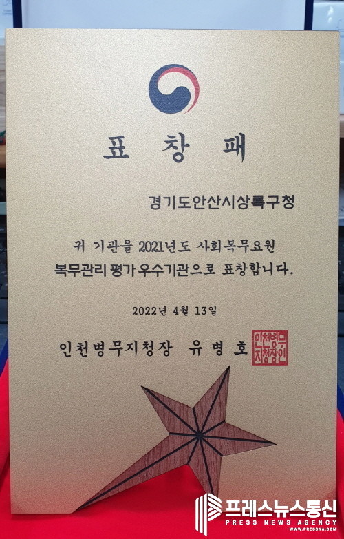 [프레스뉴스] 장현준 기자= 안산시 상록구(구청장 박양복)는 인천병무지청 주관 ‘2021년도 사회복무요원 복무관리 평가’에서 우수기관으로 선정됐다고 15일 밝혔다.