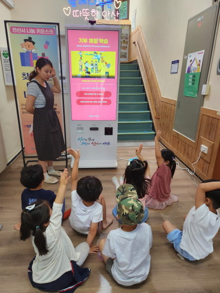 안산시청 어린이집(원장 이현순) 만 5~6세 원생 25명을 대상으로 실시된 이번 교육은 ▲어린이 맞춤형 나눔교육 동영상 시청 ▲나눔키오스크를 이용한 기부 체험 ▲나눔교육증서 배부 등의 순으로 진행됐다. 특히 안산시가 전국 최초로 도입한 ‘이동식 나눔키오스크’가 교육에 활용되어 어린이들의 눈길을 사로잡았다.