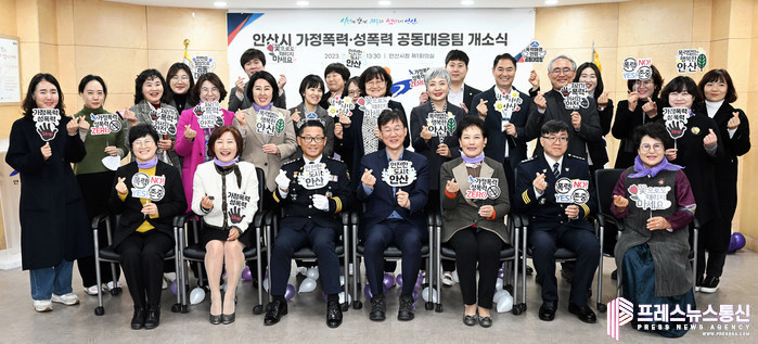 | ▲ 이민근 안산시장이 지난 3월 13일 시청에서 열린 안산시 가정폭력·성폭력 공동대응팀 개소식에서 강은석 단원경찰서장, 이민수 상록경찰서장 등 참석자들과 기념촬영을 하고 있다.(사진=안산시) |
