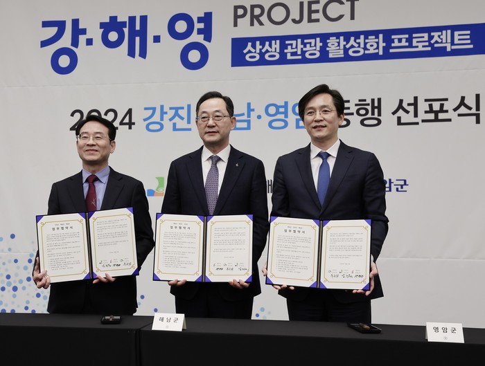 [전남=프레스뉴스] 강래성 기자= 12일 서울시 용산구 나인트리 프리미어 로카우스 호텔에서 강해영 업무협약 및 동행 선포식이 열렸다. 강진군, 해남군, 영암군이 함께 관광콘텐츠를 한데 묶은 지역 상생의 새로운 모델 “강해영 프로젝트”를 전국에 선보였다.