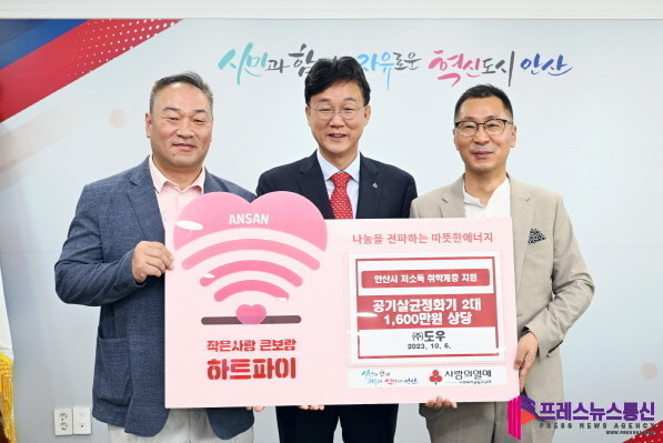 [프레스뉴스] 장현준 기자= 안산시(시장 이민근)는 지난 6일 (주)도우로부터 관내 사회복지시설을 위한 공기살균정화기 2대(1천600만원 상당)를 기탁 받았다고 10일 밝혔다.