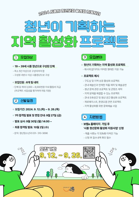 [프레스뉴스] 장현준 기자= 시흥시(시장 임병택)는 청년들이 지역 문제를 직접 고민하고 창의적인 아이디어로 해결 방안을 제시하는 ‘청년문화 활성화 지원사업’ 참가자를 9월 12일부터 26일까지 모집한다.