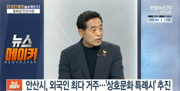 이남규, 이윤지 아나운서가 진행하는 연합뉴스 TV 뉴스 메이커 ‘초대석’ 코너에 출연한 윤 시장은 안산시가 추진하고 있는 ‘대학생 본인부담 등록금 반값지원 사업’과 함께 서해안 교통 중심지로 도약하기 위한 계획 등을 밝혔다.