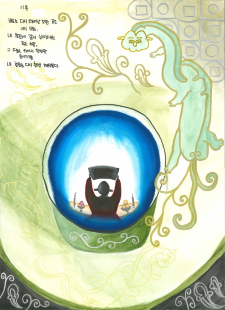 글·그림 부문 대상에는 이은서 학생(중암중 2)의 ‘이룡’이 선정됐다. 하늘과 땅을 잇는 찻잔과 찻잔 받침에 새겨진 뿔이 없는 이룡을 그림과 글로 표현한 작품으로 찻잔 안에 제례의 의식을 담은 창의적인 그림과 소망의 기원을 간결한 글로 표현해 독창적인 예술성과 창의력에서 우수한 평가를 받았다.