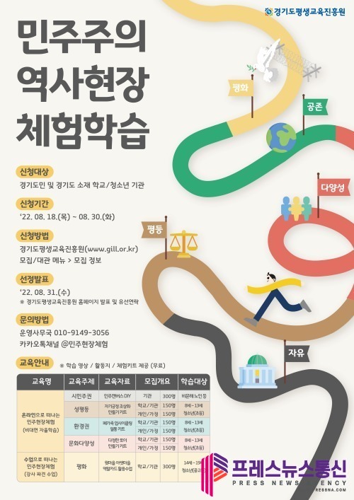[프레스뉴스] 장현준 기자= 경기도와 경기도평생교육진흥원이 8월 18일부터 30일까지 온라인 콘텐츠와 체험 꾸러미를 활용해 민주주의 가치·의미를 되새겨보는 ‘민주주의 역사현장 체험’의 참여자 1천500명을 모집한다.