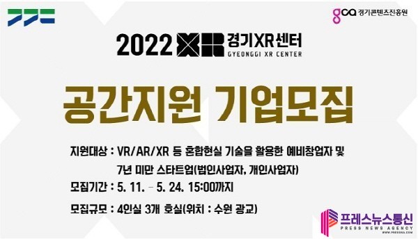 [프레스뉴스] 장현준 기자= 경기도가 오는 24일까지 경기XR(eXtended Reality, 가상·증강현실을 포함한 확장현실 실감기술)센터 공간지원 입주기업을 모집한다고 18일 밝혔다.