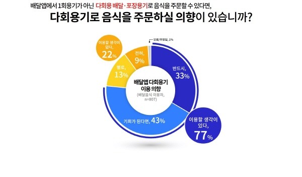 1회용이 아닌 다회용 배달·포장용기로 음식을 주문할 의향이 있는지 물어봤을 때 배달음식 이용자 807명의 77%가 ‘이용 의향이 있다’고 답했다. 또한 배달앱 이용자 586명을 대상으로 한 질문에서는 84%가 배달앱에서 음식 주문 시 1회용 수저·포크를 요청하지 않는다고 했다.