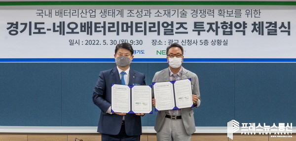 이한규 경기도 행정2부지사와 허성범 네오배터리머티리얼즈 대표(CEO)는 30일 경기도청에서 전기차 배터리 신소재의 양산을 조속히 지원하는 내용의 투자 양해각서를 체결했다.