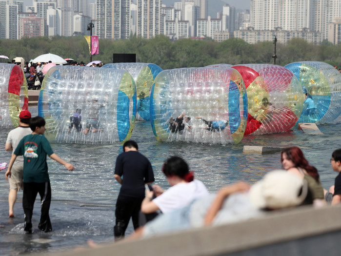 | ▲낮 기온이 전국 내륙을 중심으로 최고 29도로 치솟으며 초여름 날씨를 보인 19일 오후 서울 영등포구 여의도 한강공원 물빛광장에서 시민들이 워터볼 굴리기를 하고 있다. /사진=뉴스1 |