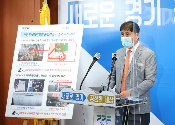 인치권 경기도 특별사법경찰단장은 8일 경기도청에서 기자회견을 열고 “지난 3월 22일부터 4월 2일까지 도내 유해화학물질 제조‧사용‧운반‧저장‧판매 사업장 278개소를 대상으로 집중단속해 허가를 받지 않거나 관리를 소홀히 한 67곳을 적발했다”고 밝혔다.