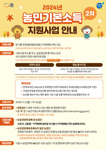 | ▲2024년 농민기본소득 지원사업 2차 신청 안내 포스터(사진=시흥시) |
