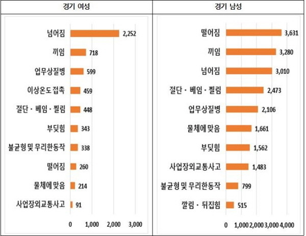 성별 발생형태를 보면 여성은 넘어짐(37.7%), 끼임(12.0%), 업무상 질병(10.0%) 등의 순인 반면, 남성은 떨어짐(16.7%), 끼임(15.1%), 넘어짐(13.8%) 등의 순이다.